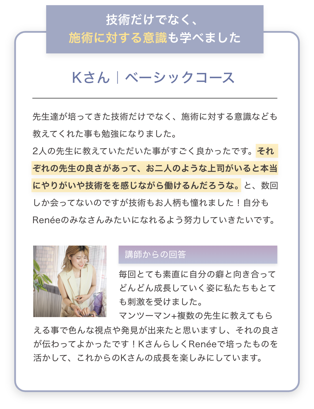 自身のサロン育成のセミナーでは、募集1分で満席となるほどスタッフ育成への評価は高く、顧客満足はもちろんネイリストが働きやすい環境作りに力を入れ、技術研修や商品開発も行う。